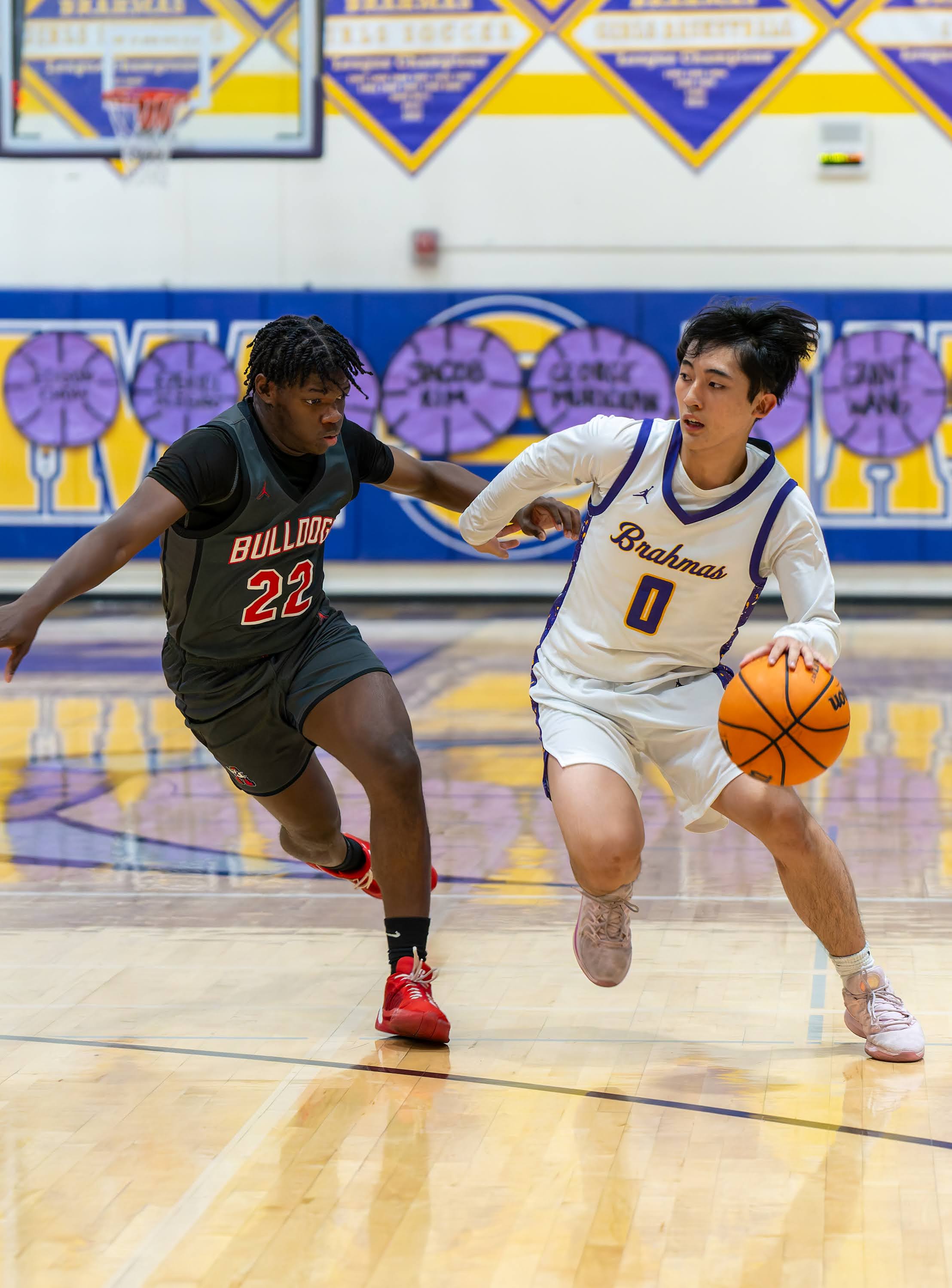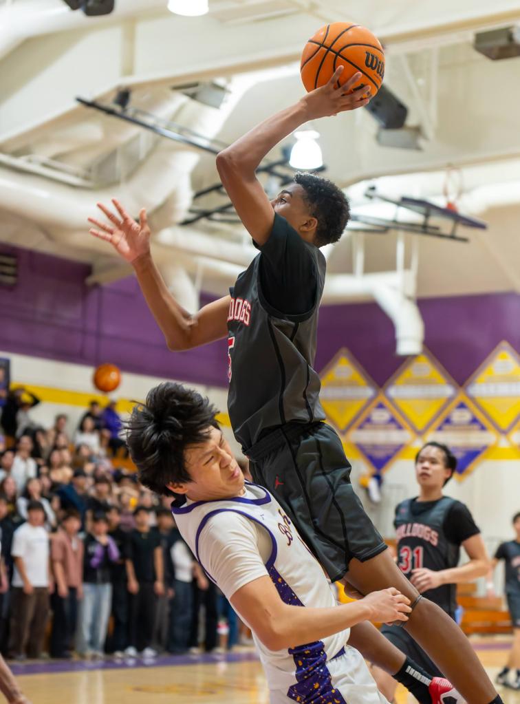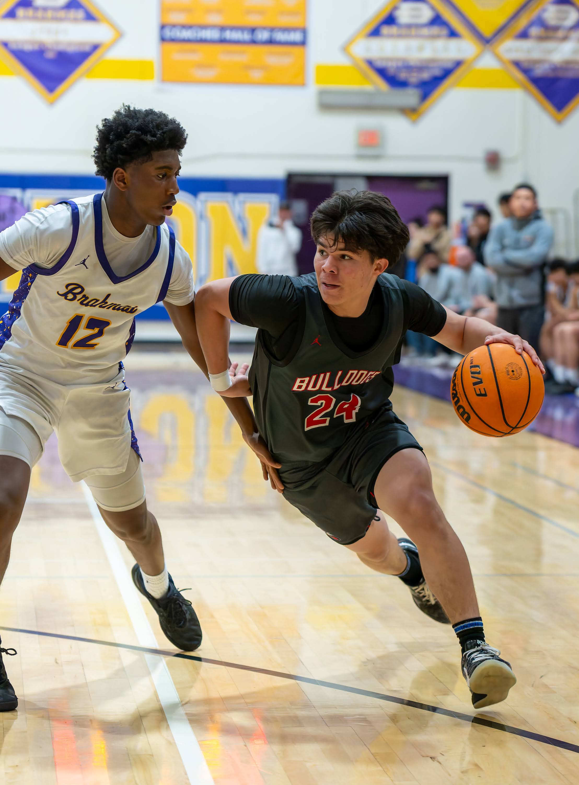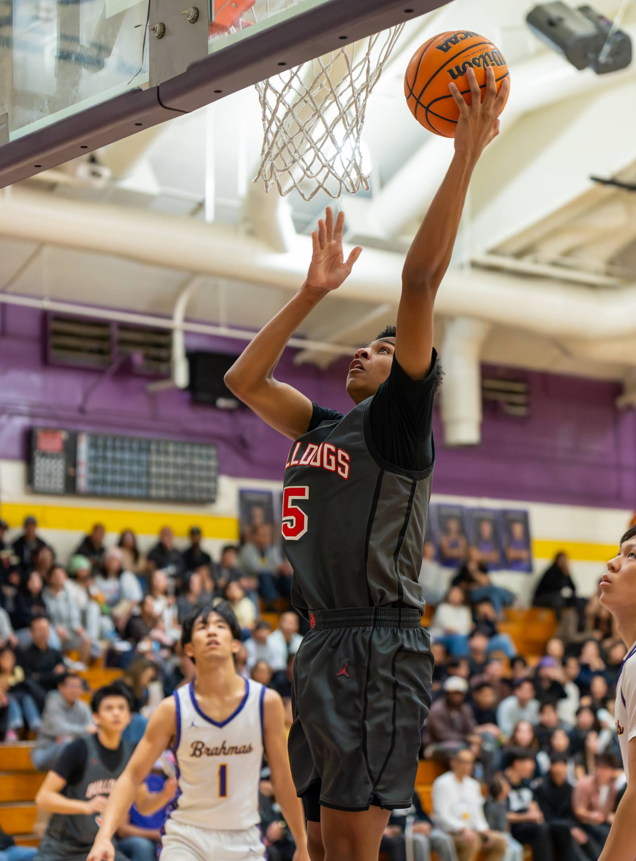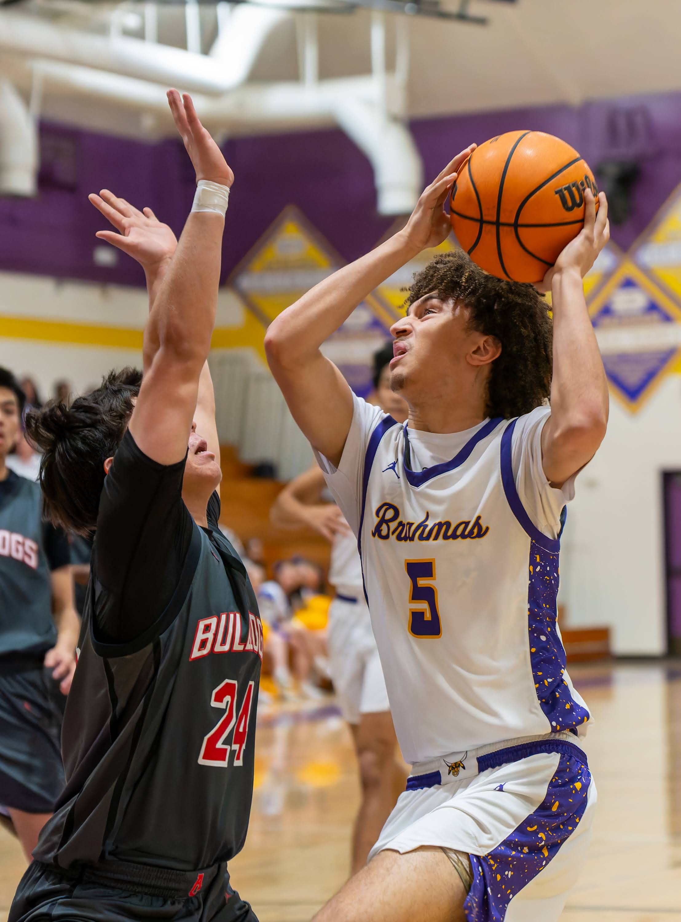 The opening quarter featured early balance, with the score tied at 12 with 3:33 remaining. Diamond Bar’s Jacob Kim connected on three three-point baskets in the period to lead the Brahmas with nine points, while Ayala’s Brenden White also scored nine points to pace the Bulldogs. Ayala closed the quarter on a run to take a 21–15 lead.